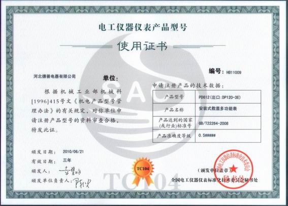 2010年6月21日,我公司電力儀表產(chǎn)品獲得全國電工儀器儀表標(biāo)準(zhǔn)化技術(shù)委員會秘書處根據(jù)機(jī)械工業(yè)部機(jī)械科【1996】415號文《機(jī)電產(chǎn)品型號管理辦法》頒發(fā)的電工儀器儀表產(chǎn)品型號使用證書。產(chǎn)品符合國家標(biāo)準(zhǔn):GB/T22264-2008 安裝式數(shù)字顯示電測量儀表。本次頒發(fā)的型號為: